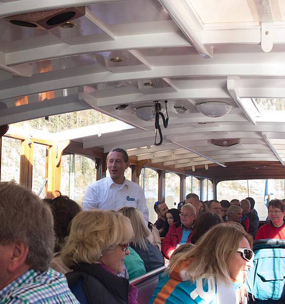 這艘船上滿滿的旅客,圖中穿白襯衫的正是此艘船上主持的工作人員