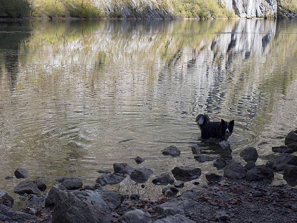除了悠然自得的綠頭鴨外,也有遊客帶狗兒在此戲水