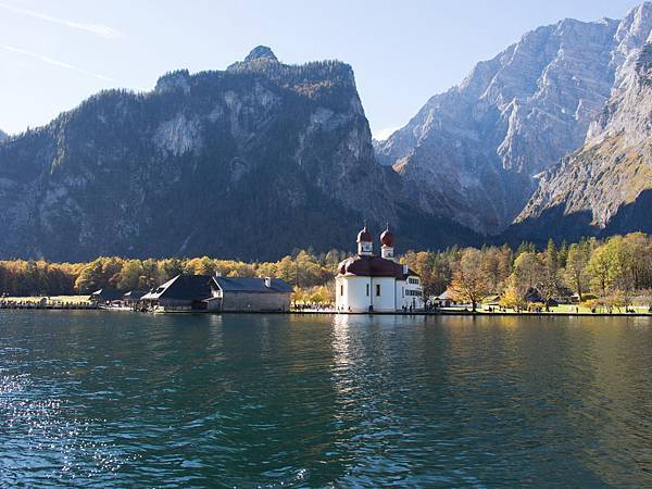 紅蔥教堂周邊翠綠的湖水與些許變臉的樹葉