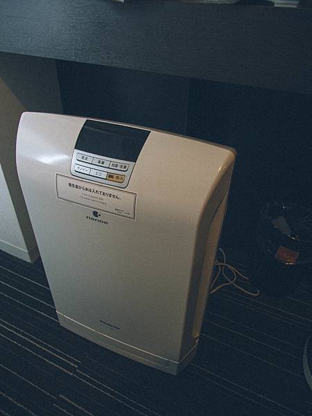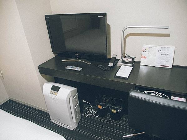 長方形書桌除了有電視之外,還有提供檯燈以及panasonic空氣清淨機(可以調節風量、氣流以及加濕)