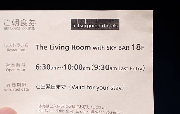 另一張是早餐券用餐時間是6:30-10:00,用餐地點在18樓在大廳旁的The Living Room with sky bar。