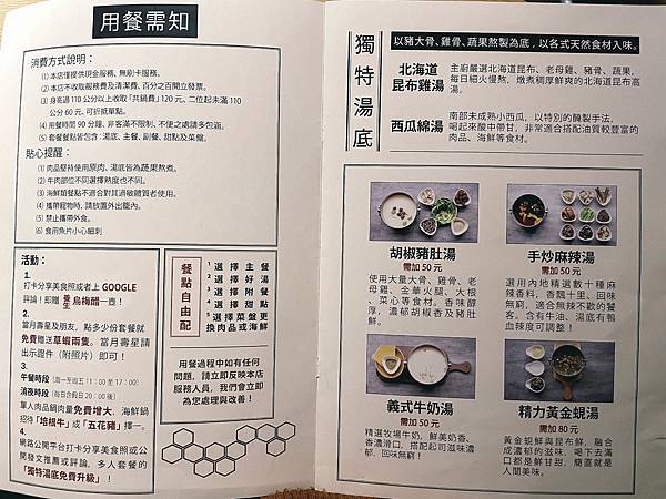 基本湯底分為兩種:北海道昆布雞湯、和西瓜綿湯。另外要加錢的有胡椒豬肚湯(+50)、手炒麻辣湯(+50)、義式牛奶湯(+50)、精力黃金蜆湯(+80)。