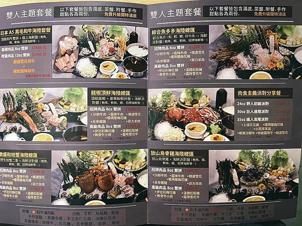 另外還有雙人主題套餐如日本A5黑毛和牛海陸套餐、龍蝦頂鮮海陸總匯、豐盛和旭蟹海陸總匯、綜合魚多多海陸總匯、肉食主義派對分享餐及放山烏骨雞海陸總匯。