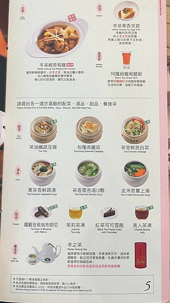、綠茶人參雞、茶王無錫排、普洱牛肉及桂香珍魚