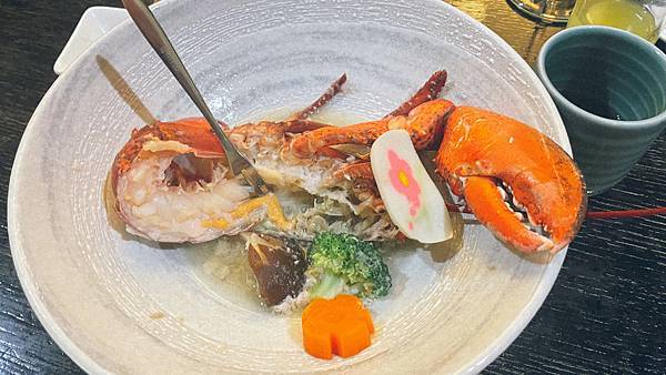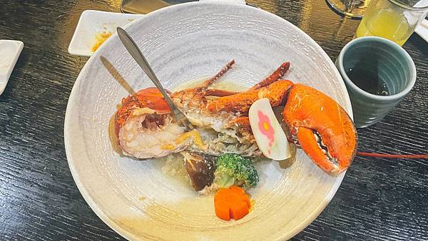 我們點的客製2000元套餐,包括酥炸牛蒡、生魚片料理、清蒸紅條魚、鮑魚、明太子竹筍燒、龍蝦、炙燒和牛或烤羊排、 魚翅、麻油雞及紅豆湯、當令水果。