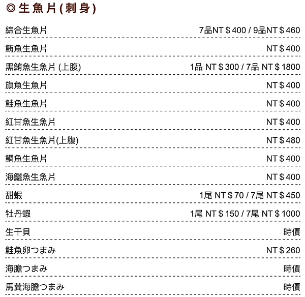 菊川主要分為菊川午膳套餐、主廚精選套餐、定食以及單點(生魚片、季節料理、壽司、鍋物、握壽司)