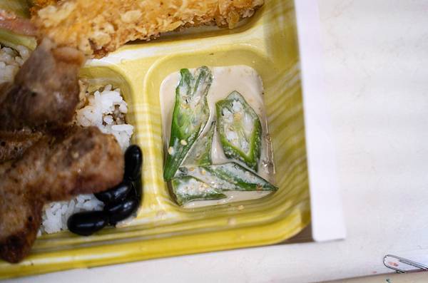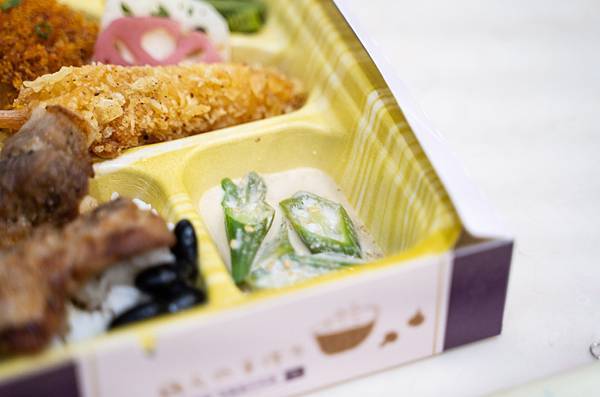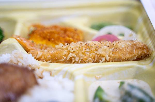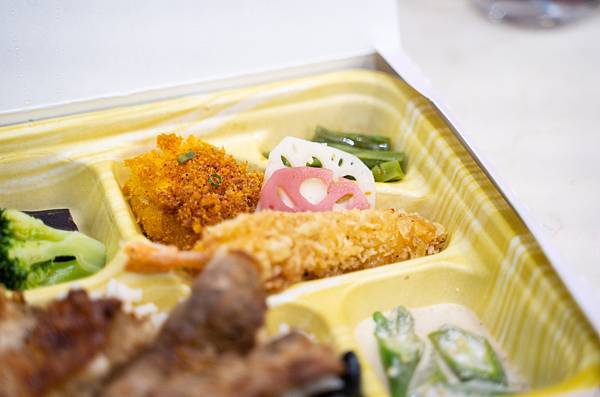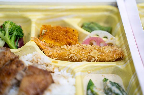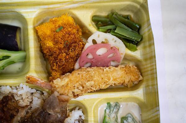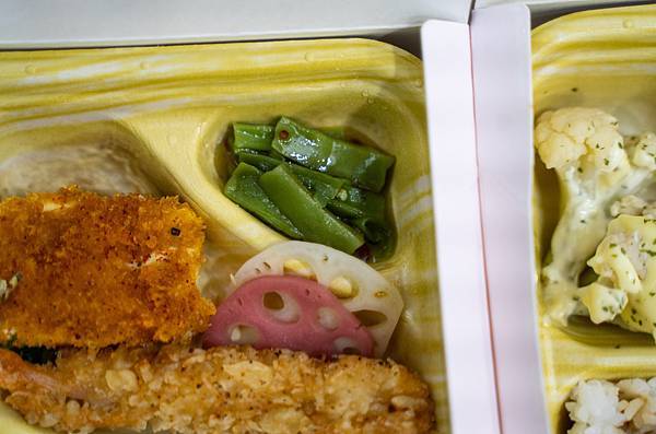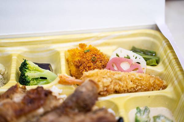 先說說外觀,陶板屋的餐盒當然是很美倫美奐,內裝食物也很講究配色,蔬菜的綠,白與粉紅的蓮藕加上金黃色的炸蝦和黑色的黑豆顏色很豐富。