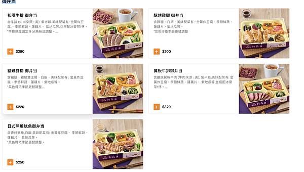 外帶的有御弁当 、套餐、 滿腹對策分享餐、單點-小食、單點-飲料單點、甜點等