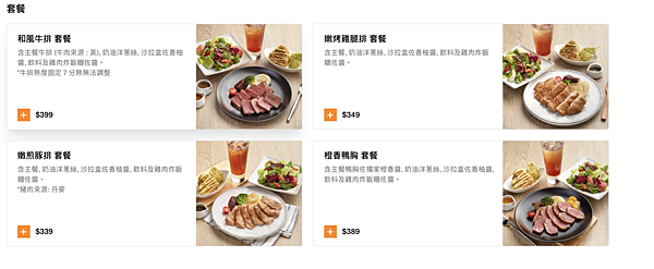 套餐:除了主餐還包括 奶油洋蔥絲, 沙拉盒佐香柚醬, 飲料及雞肉炸飯糰佐醬。